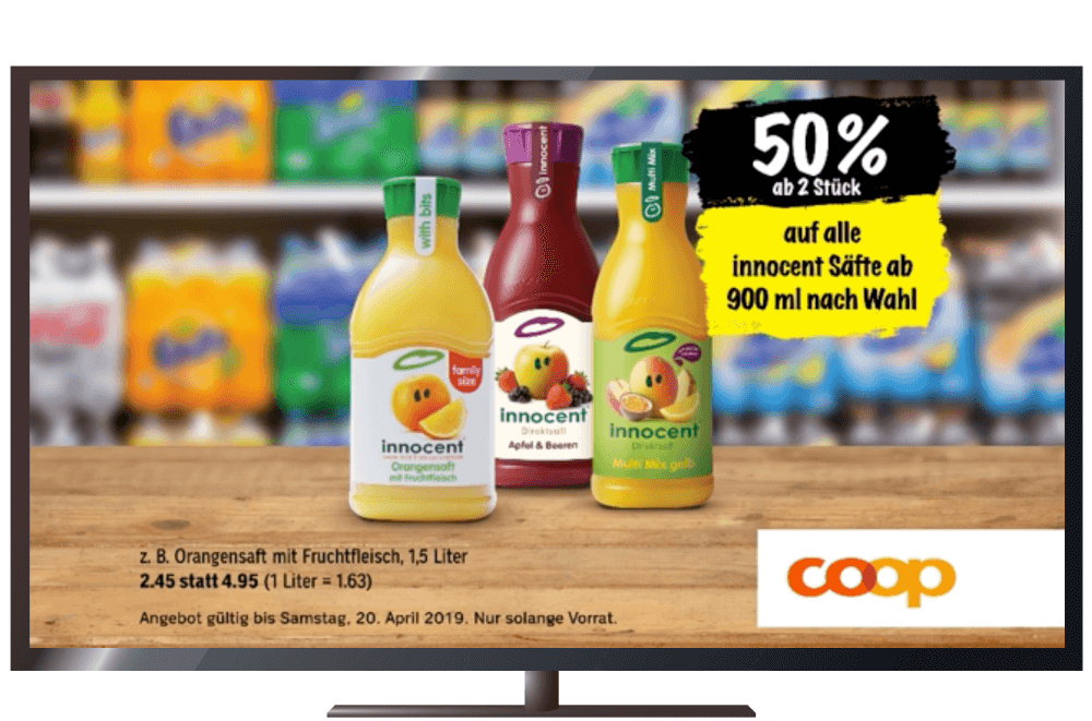 Bringen Sie die Konsument:innen auf ihrem Wocheneinkauf auf die wichtigsten Aktionen bei Coop. Mit dem Coop-Aktionsspot auf allen relevanten TV-Sendern. Der 5 Sekunden Spot wird an den bestehenden Coop-Aktionsspot angehängt und erreicht bis zu 75 GRP.