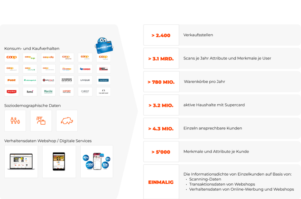 Fahren Sie damit wirkungsvollere Display- und Video-Advertising-Kampagnen auch ausserhalb des Coop-Universums und profitieren Sie vom einzigartigen Coop-Datenuniversum dank der Verwendung von Transaktions- und Kassendaten sowie effektiv erhobenen soziodemografischen Daten.