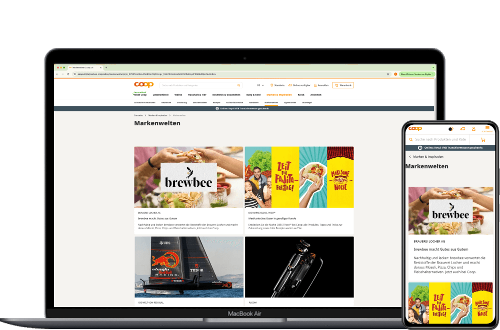 Dank der Möglichkeit einer eigenen Markenwelt auf coop.ch landen potenzielle Konsument:innen auf Ihrer individuell gestalteten Markenseite im Look&Feel Ihres Brands. So können Sie Ihren Konsument:innen emotionaler und informativer Content und Mehrwert bieten.