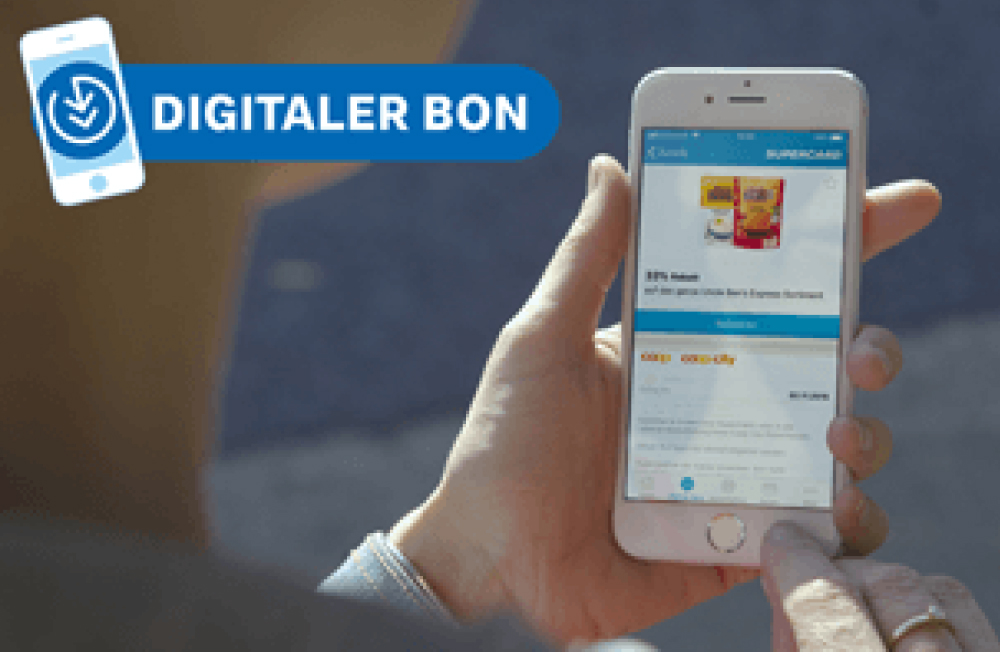 In Kombination mit Inseraten in der Coop Presse, Regalbroschüren oder Direct Mailings wird ein Digitaler Bon in der Supercard-App aufgeschaltet.