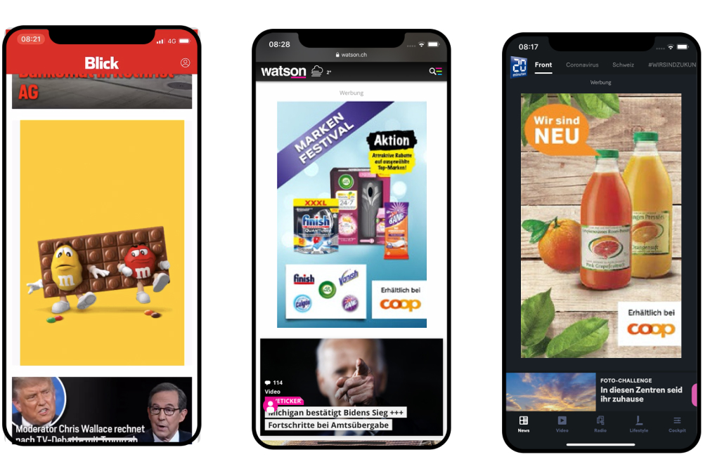 Mit den Display Bannern auf den beliebten Schweizer Newsportalen (Blick, 20 Minuten und Watson und neu auch auf Newsnet) erreichen Sie Ihre potenziellen Kund:innen auch ausserhalb des Coop-Universums.