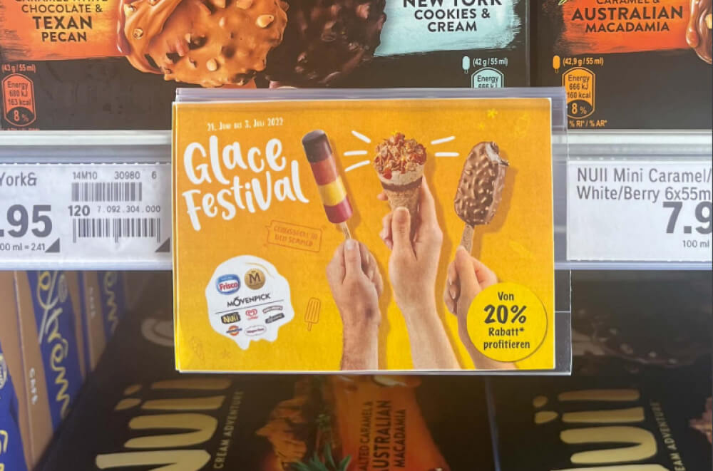 Platzierung direkt bei Ihrem Produkt am Tiefkühlschrank-Regal in 325 Coop-Verkaufsstellen ab B-Format und in 525 Coop-Verkaufsstellen ab A-Format in der Gesamtschweiz.