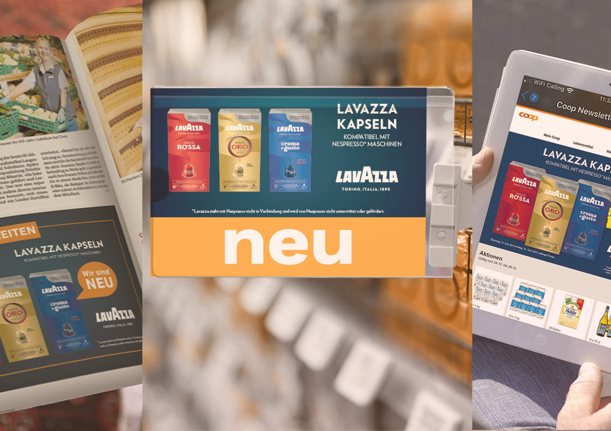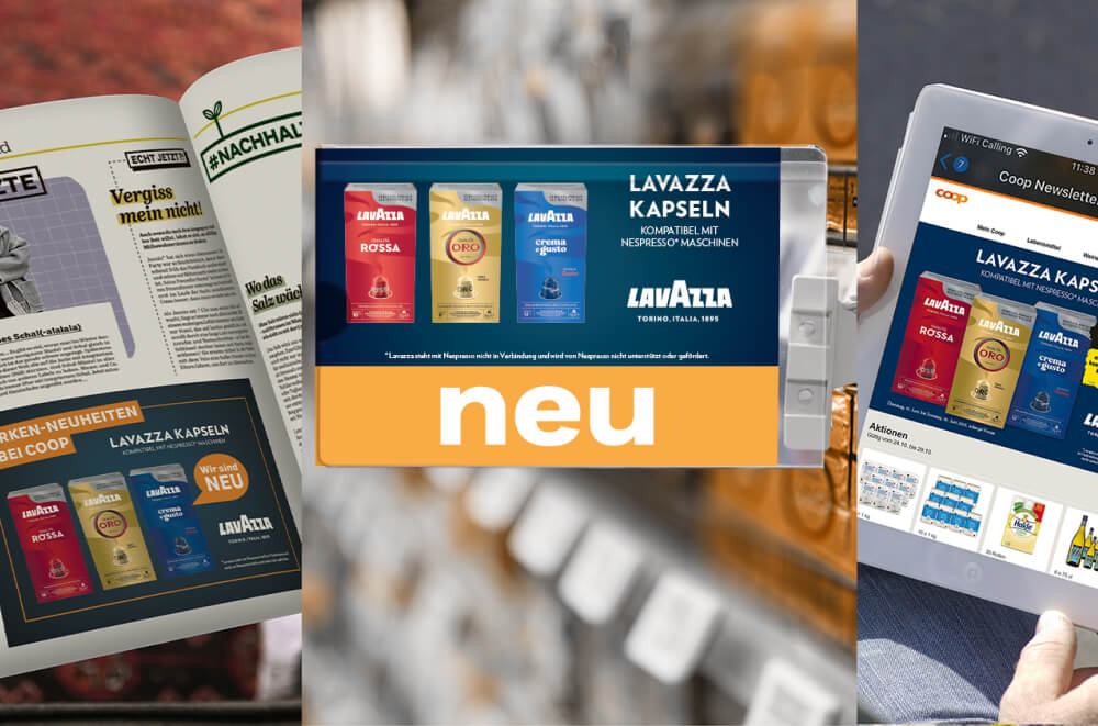 Crossmedialer Einsatz verschiedener Werbemittel: Coop Presse, Regalbroschüre oder Querstopper, In-Store-Radio oder Online Banner auf coop.ch oder Social Media.
